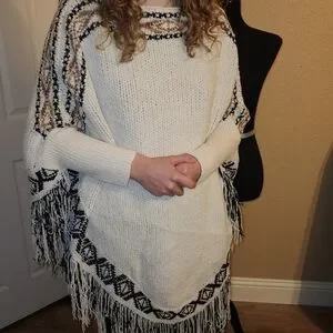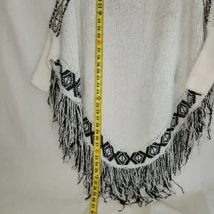 Fringed Knit Chenille Sweater Poncho - White and Black With Tan Detail. Western
