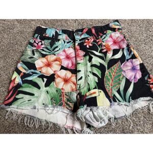 Zara TRF Denim Shorts Womens Size 6 High Rise Tropical Birds Colorful Fringe