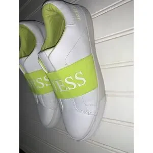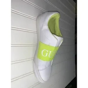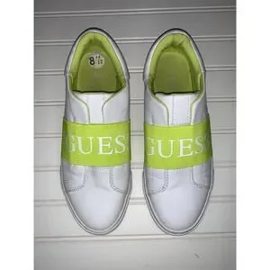 The product is a pair of Guess white fluorescent yellow slip-on women's tennis shoes in size 8.5 medium. The shoes are designed specifically for tennis performance, featuring a slip-on style for easy wear. The color combination of white and fluorescent yellow adds a stylish touch to the casual design, making them both functional and fashionable for women looking for comfortable shoes for their active lifestyle.