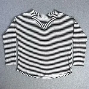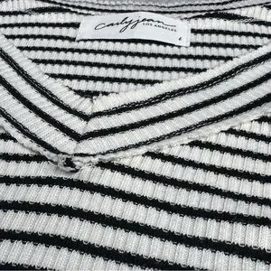 Carly Jean Los Angeles black and white striped long sleeve top. Ribbed material provides a comfortable fit. Features a flattering V-neck design. Ideal for versatile styling.