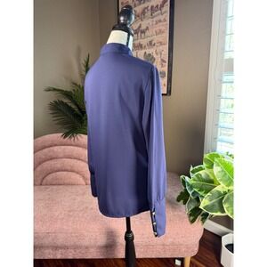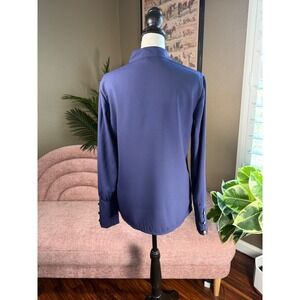 Command attention in this sophisticated blouse, a statement piece that exudes refined elegance. A sleek mock neck leads to a subtle front slit, adding a touch of allure, while the rich navy hue provides a versatile backdrop for any ensemble. Gold-tone buttons adorn the shoulder and cuffs, lending a luxurious accent to the tailored silhouette. This blouse is perfect for a power lunch, an evening cocktail party, or adding a polished touch to your everyday office attire.