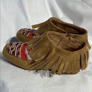 Stylish fringed suede ankle boots featuring a vibrant patterned toe. Perfect for adding a unique touch to any outfit.
