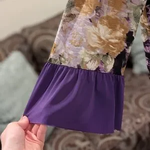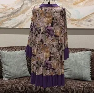 Embrace new with tags elegance with this stunning floral plum tunic. Featuring a beautiful blend of colors with a dominant purple hue, this dress is perfect for any occasion. Its stylish design and vibrant pattern make it a must-have addition to your wardrobe. Ruffle on bottom and on sleeve. Functional tie neckline