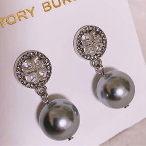 Chic Tory Burch earrings with silver detailing and gray pearl drops. Ideal for elevating any look.