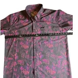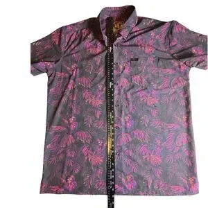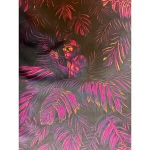 Own the party with this eye-catching Retro Rifle short sleeve button-up shirt. The vibrant tropical print features a playful monkey wielding a rifle, set against a backdrop of lush leaves in striking shades of purple, pink, and yellow. This shirt is designed to make a statement, perfect for beach vacations, casual outings, or adding a touch of edgy fun to your wardrobe.