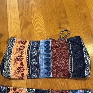 Stylish strapless bikini with a boho pattern. Features a mix of red, blue, and cream colors.