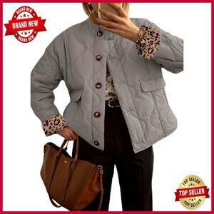 Quilted Puffer Jacket Button Down Leopard Print Casual Winter Coat Oversized