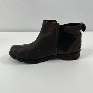 The Sorel Women's Size 7 Emelie Chelsea Booties in Gray Brown Black are a stylish and practical choice for the winter and fall seasons. These ankle boots feature a round toe shape, low heel height, and waterproof exterior, making them perfect for outdoor casual occasions. Crafted with leather upper material, these Chelsea-style boots with a brown exterior color bring both fashion and functionality to your wardrobe. The Sorel brand is known for quality, and this model is part of the Emelie product line, guaranteeing both comfort and durability in a versatile design.
