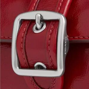 Chic and vibrant Coach crossbody bag. Features rich cherry red leather. Stylish buckle detail. Ideal for any outing.