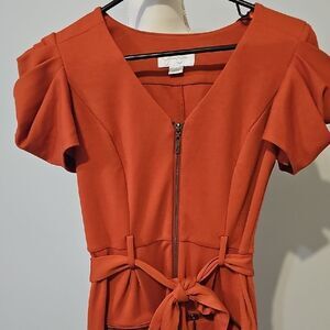 Chic mini dress with puff sleeves. Features a front zipper and tie belt. Zip pockets. Ideal for stylish outings & perfect for fall & fall pictures.
