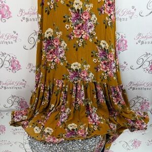 Mia joy dress long ruffle hem flowers crochet lace details Floral Mustard Dress