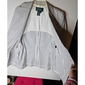 Newly dry cleaned. Lauren Ralph lauren cotton blend blazer. Super stylish. Work wear. Wedding formal wear. Size M. Unisex. White and black stripes. From non smoking home. Please See Pictures for the details and measurements. Offers Welcome. I ship same day or next day.