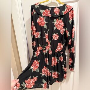 Chic black romper with vibrant floral print. Features long sleeves and a flattering V-neckline. Perfect for casual or dressy occasions.