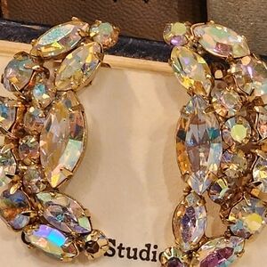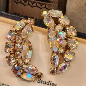 Vintage Ab Rhinestone Crescent Shaped Ear Hugger Clip Earrings Gold Tone 1.5"