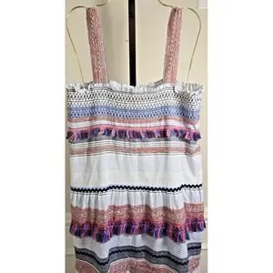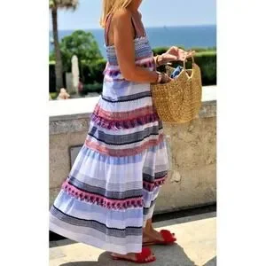 Beautiful ZARA boho striped midi dress with multicolor embroidered trims, tassels, and smocked bodice. Breezy A-line silhouette with wide straps and flowing movement. Women's size Medium. Very good pre-owned condition—light normal wear only. Perfect for beach vacations, summer outings, or warm-weather travel.