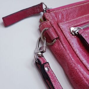 Sweet pink leather oblong wristlet from Nordstrom's in house line. Candy stripe poly lining with multiple interior pockets and a zipper pocket. Lightly used condition and totally clean. No stains or tears. Silver metal harware is still nice and bright no tarnishing. Contrast stitching details. 2 small exterior pockets on the front also. Detachable wristlet strap. Very light wear to the two bottom corners, see pic.