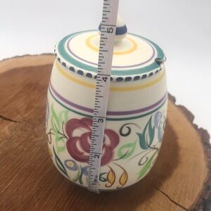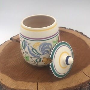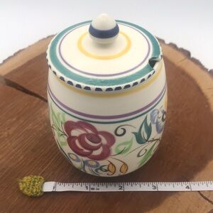 VTG (1920s-30s)Poole Pottery Preserves/Honey Jar…Lidded w/ notch for spoon/honey dipper…Handmade…Handpainted with birds & flowers pattern…Made in England…Stamped 287 on Bottom…Signed on bottom of jar & also on underside of lid…Measures approx 5" tall x 3-1/2" wide…Excellent vintage condition (no chips, cracks, or repairs)