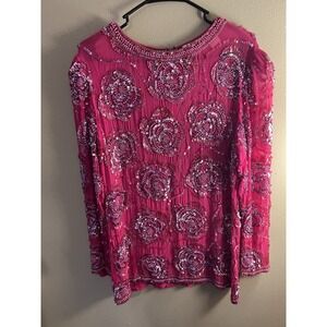 Keywords: sequin top, beaded top, embellished top, pink blouse, party top, long sleeve top, vintage top, cocktail top, Nite Lime, silk top, rose pattern, formal top