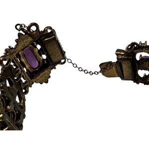 Ornate antique unsigned Selro Selini bronze bracelet showcasing striking purple cabochon stones complemented by delicate faux pearls. The intricate metalwork features scroll details and a secure clasp closure with a safety chain for added security. This bracelet offers a statement piece with a rich, antique aesthetic.