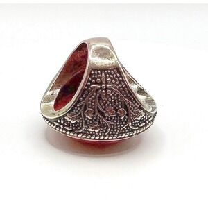 Keywords : vintage style ring, red cabochon ring, brass statement ring, boho jewelry, unisex ring, artisan ring, bold ring, southwestern style ring, cocktail ring, unique vintage ring, gift for her, gift for him, vampirecore ring, witchy ring, gothic ring, dark academia