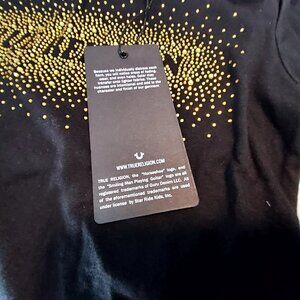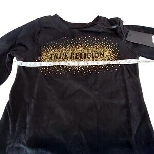 This True Religion tee for girls in size L (6X) showcases a sleek black design accented with shimmering gold studs, creating a stunning visual appeal. Constructed from 100% cotton, it promises a soft and breathable touch, making it not only fashionable but also comfortable. The long sleeves add versatility for cooler days.
