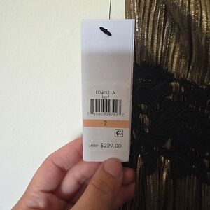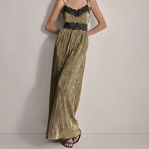 Stunning gold maxi dress featuring delicate black lace details. Perfect for formal occasions.