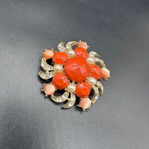 Vintage Brooch Pin Orange Clear Rhinestones Faux Tone Gold Tone Star Burst Swirl