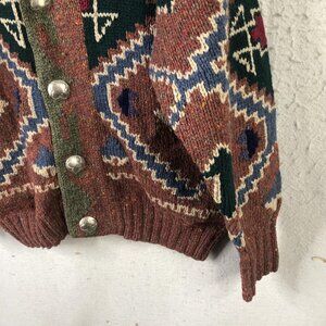 Previously worn with moderate overall wool pilling and scattered lint from normal use and storage. Ribbed cuffs and hem show slight stretch and wear at the edges but remain intact; silver-tone concho buttons have light surface scratches yet fasten securely. Knit fabric, collar, and seams are clean and intact with no holes, tears, or stains; interior brand, size, fiber content, and care tags present. Please note a couple of loose thread areas that could be darned (can see if hold up to light)