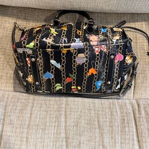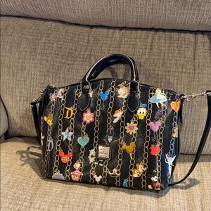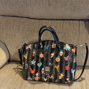 Dooney and Bourke featuring Disney characters, including Donald Mickey, Bambi, Pluto, Chippendale, Tinker Bell, and more characters on a black background beautiful bag from a smoke free pet free home
