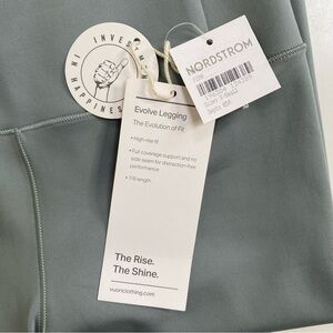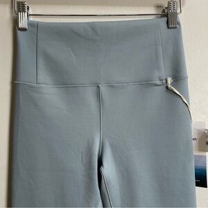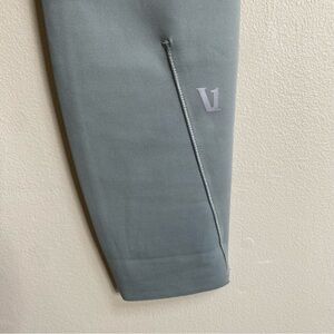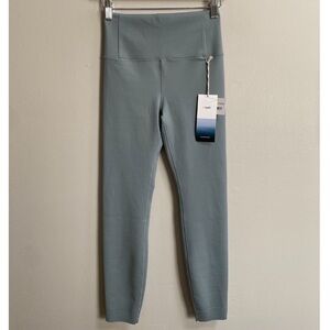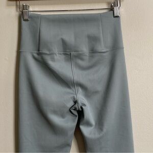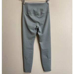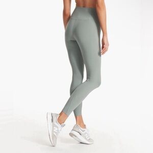 Cut from the brand's V1 Uplift performance fabric, these leggings have a comfortable high waist and a hint of shine so you'll look as good as you feel. Great for a studio workout or daily wear. Solid sage green color with a hint of shine. Performance stretch knit make these feel as good as you'll look. 4-way stretch. Moisture-wicking. Pull-on. High waist. Angular calf seams. Logo at back right leg. 7/8 length. Raw edge hems. Partially lined.