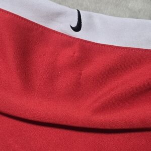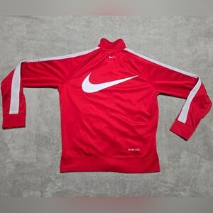 Vibrant red jacket with iconic white swoosh logos. Ideal for active and casual wear. 5 swoosh total plus embroidered spell out of swoosh.