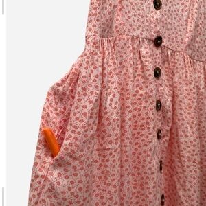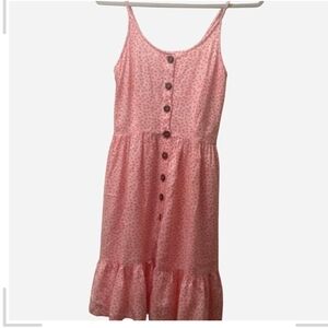 Stylish pink dress with floral pattern. Features button-down front and spaghetti straps. Perfect for casual outings.