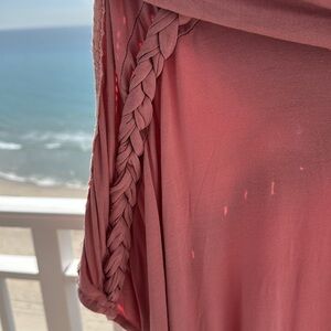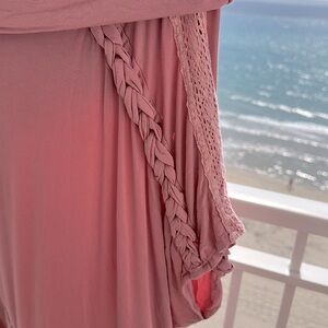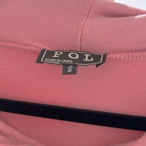 POL Chic soft pink top/tunic - Comfortable and stylish. Wide collar that flows into a hood. The sleeves almost dolman type has beautiful detailed lace and knotted fabric down the sleeves. Has pocket pouch in front. The back is longer than the front. This is a size Small - measures approximately armpit to armpit 26” with a bit of stretch. Shoulder to length front measures approximately 26” with the back measuring approximately 36”. Very stretchy … attractive - wear with jeans, shorts or just as a beach coverup. NWOT