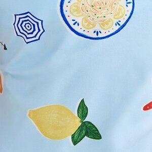 This elegant strapless dress features a playful print on a soft blue background. Perfect for any occasion or vacation, it combines style and comfort effortlessly.