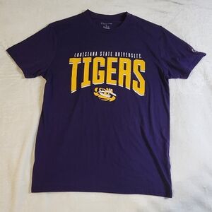 Classic purple and gold Champion LSU Tigers t-shirt. Soft and comfortable fabric. Unique raised design on the word Tigers. Champion logo on sleeve. Excellent condition! Size Medium. See pictures for measurements.