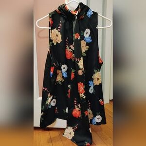 Chic & sophisticated, this romantic & colorful Anthropologie silky halter tank featuring a vibrant floral print, lace‑trimmed V‑neckline, and a beautifully draped silhouette is a versatile, must have statement piece. The attached scarf can be worn in the front or back. Can be dressed up or down, wear alone or pair with a jacket for an all season look. Made from soft, fluid 100% polyester and finished with a keyhole button‑back closure, this piece blends elegance with ease — perfect for date nights, layering, or elevated everyday style.