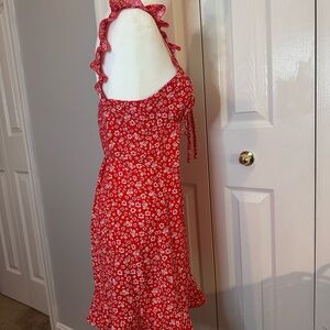 Turn heads in this flirty Hello Molly mini dress featuring a vibrant red base with a delicate ditsy floral print. Designed with ruffle shoulder straps, a flattering fitted bodice, and a playful fit-and-flare silhouette with a ruffled hem. Lightweight and feminine—perfect for summer days, brunch dates, vacations, or casual events. Excellent condition, size 6. See photos for measurements, contact me with any questions. Will ship within 24 hours. Thanks! Chris