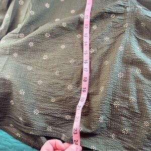Easy, flattering olive green blouse with an allover mini floral print. Features a soft V-neckline with subtle front ruching for shape, relaxed short sleeves, and a lightweight textured fabric that drapes nicely without clinging. The back has a V-neck as well, giving it a polished but casual look.