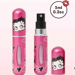 Stylish pink atomizer with Betty Boop and heart design. Ideal for travel. 5ml capacity.