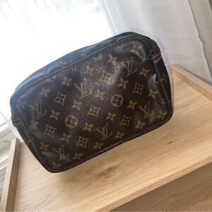 This is an authentic LOUIS VUITTON Monogram Compiegne 23 Toiletries Bag. This is a handsome toiletries case with a look of tradition and sophistication. The case is crafted of Louis Vuitton monogram toile canvas is reinforced with natural vachetta cowhide leather. This is apparent with piping around all borders, a cross strap trim for a frontal pocket, a side trim and bottom corner plates. The bag has a top zipper that opens to a terracotta cross grain leather interior. This interior is a very practical space, useful for toiletries, cosmetics or other uses you may have for this stylish and luxurious bag from Louis Vuitton.