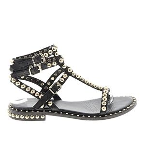 Bold black sandals with striking gold studs. Features adjustable straps for a secure fit. Ideal for adding edge to any outfit.
