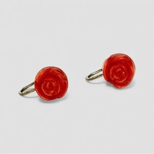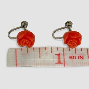 🌹 Vintage Carved Red Rose Screw Back Floral Earrings Faux Coral Jewelry