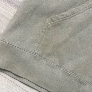 Distressed and faded throughout with some discolouration on pouch pocket. Has had a repair job done near the neck. Missing hoodie strings