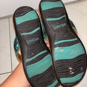 Chic Vionic sandals with teal straps. Comfortable brown footbed. Ideal for everyday wear.
