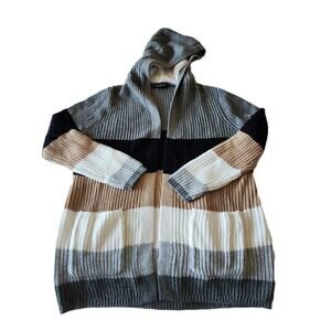 NWT: Cozy, multicolor (grey, black, tan, & cream) colorblock 100% acrylic long knit sweater with attached sherpa lined hood / long sleeves / open front / medium weight by Almost Famous.