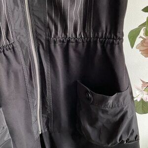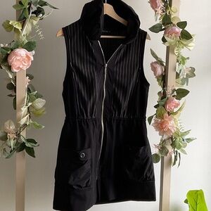 Chic black hooded vest with zipper front. Features sleek design and front pockets. Ideal for layering.