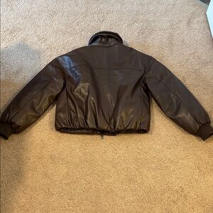 A like-new Abercrombie & Fitch Vegan Leather Bubble Hem Coat. Size: S. Color: Coffee. Purchased January 2026 and worn twice!!