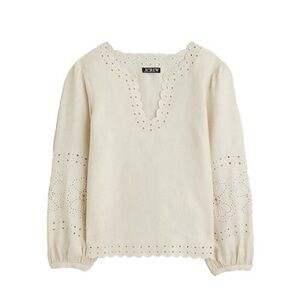 J.Crew Bungalow top in a natural ivory tone crafted from breathable linen. Features a scalloped V-neckline with eyelet embroidery, long balloon sleeves with detailed cutwork, and a relaxed silhouette. Lightweight and perfect for warm weather or layering. New with tags.
