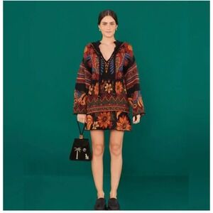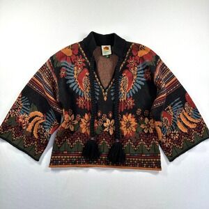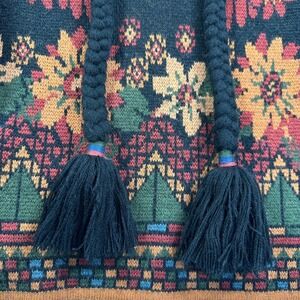 Gorgeous FARM Rio sweater featuring a vibrant V-neck design with decorative braided tassels. Intricate knit pattern showcases colorful birds and floral motifs across the front and back. Bell sleeves and a banded hem complete this eye-catching piece. Rare design - hard to find and truly better in person!