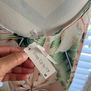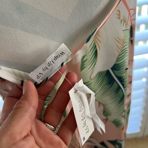 Elegant floral chimes/dress Hibiscus and palm fronds adorn the flattering silhouette, luxe enough for a night out and relaxed enough to lounge poolside. With a tropical print, shades of pink and green.